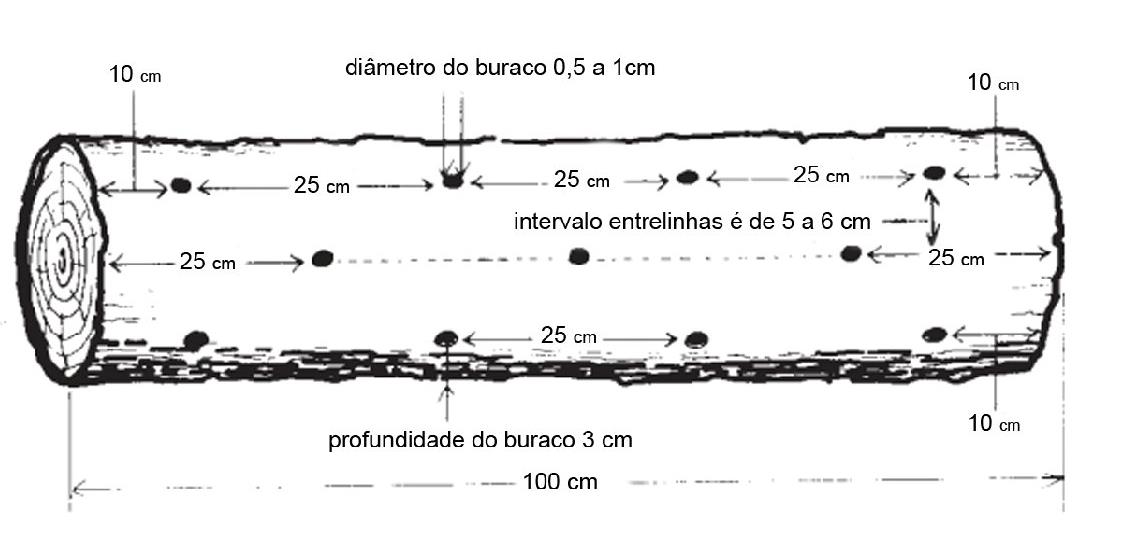 Os troncos devem ser dispostos na horizontal. Com recurso a um berbequim, deve fazer-se um furo de diâmetro igual ou ligeiramente superior à dimensão da cavilha (habitualmente 8 mm) com 2 a 4 cm de profundidade (aproximadamente 1,5 vezes o comprimento da cavilha). Os furos devem ter um espaçamento de 15-25 cm na linha e as linhas ao longo do tronco devem ser espaçadas entre 5 e 10 cm.