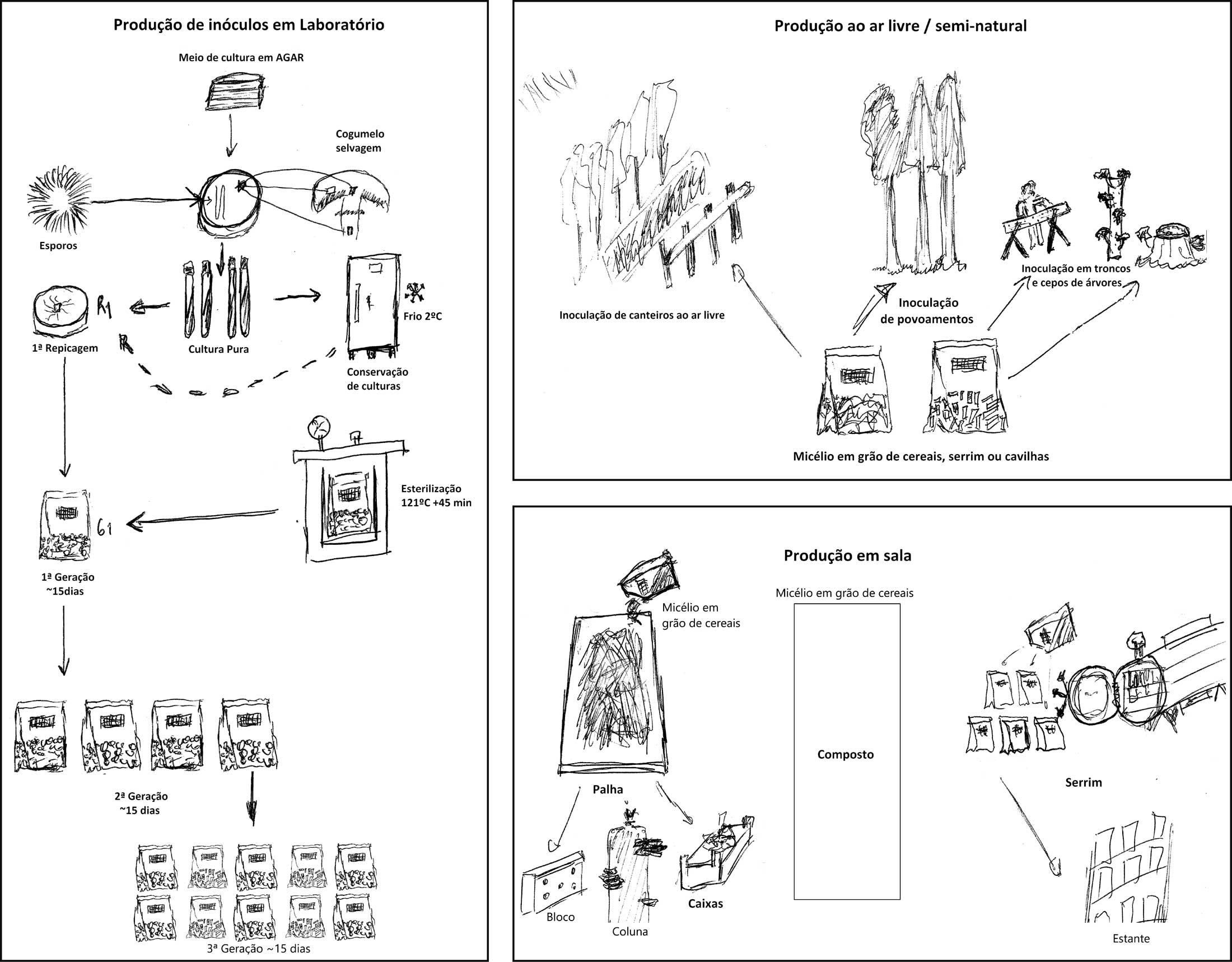 A imagem a seguir evidencia todas as fases de isolamento de culturas e cultivo de cogumelos.