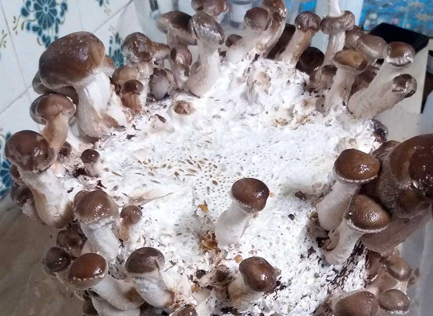 Após a inoculação (colocação de micélio em grão de cereais dentro do saco de serrim esterilizado), o saco deve ser devidamente vedado com uma seladora a quente e colocado num local escuro, à temperatura de 25 °C. Acima de 35 °C ou abaixo de 5 °C o micélio deixa de crescer e pode ficar danificado.
