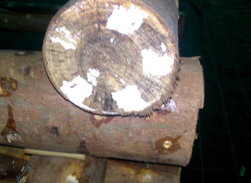 Os troncos devem ser dispostos na horizontal. Com recurso a um berbequim, deve fazer-se um furo de diâmetro igual ou ligeiramente superior à dimensão da cavilha (habitualmente 8 mm) com 2 a 4 cm de profundidade (aproximadamente 1,5 vezes o comprimento da cavilha). Os furos devem ter um espaçamento de 15-25 cm na linha e as linhas ao longo do tronco devem ser espaçadas entre 5 e 10 cm.
